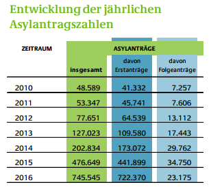 A német statisztikai hivatal szerint 2016 -ban 722.370 új menekültjogi kérelmet regisztráltak Németországban. Ez a szám 63,5%-os növekedés 2015 -höz képest (441.899).