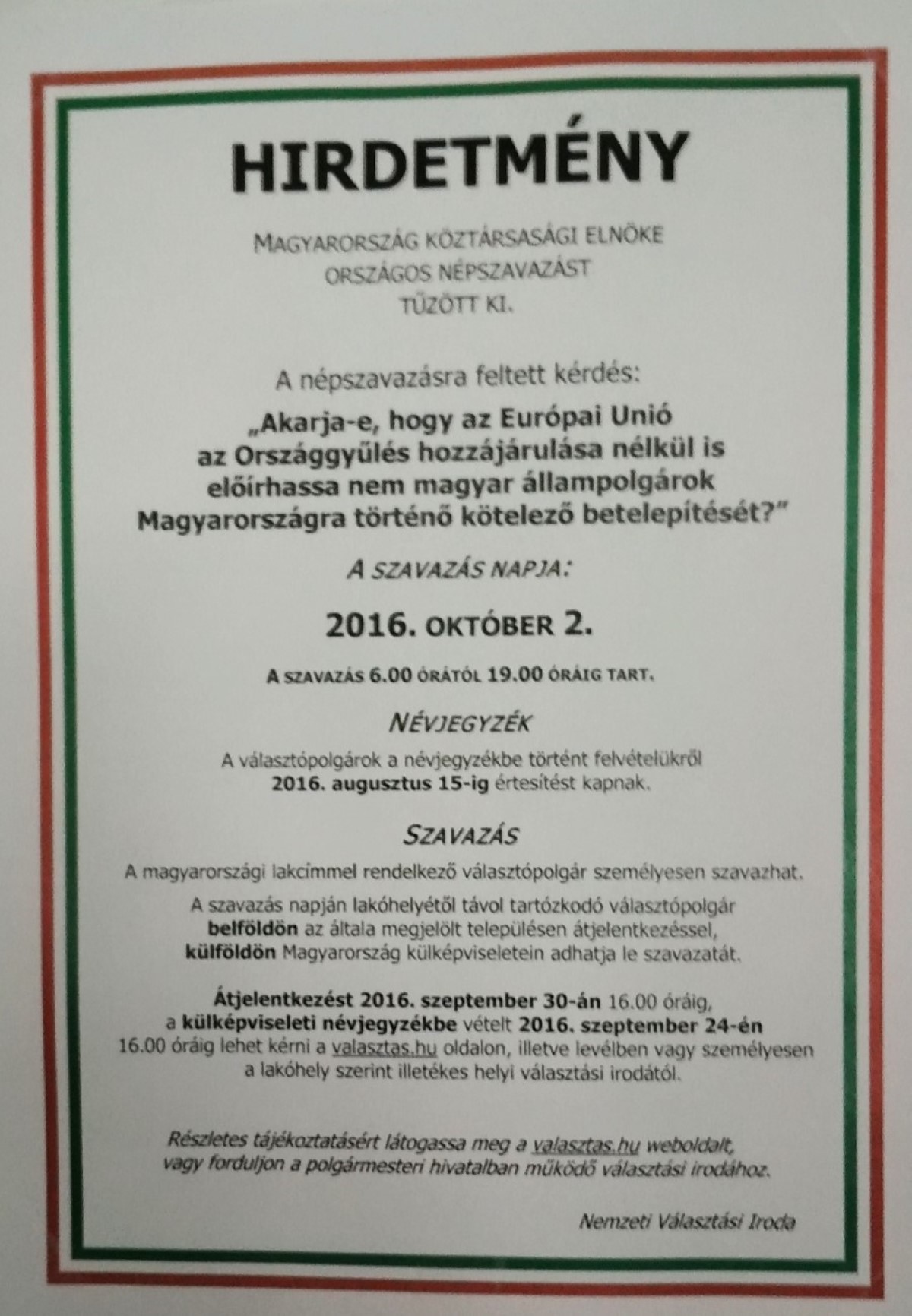 A külképviseleti névjegyzékbe vételt 2016 szept. 24.-én 16:00-ig lehet kérni a valasztas.hu oldalon illetve levélben vagy személyesen a lakóhely szerint illetékes helyi választási irodától.